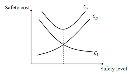 Safety objectives are fundamentally qualitative in nature and often evaluated based on the level of the objectives. To quantify safety objectives, this paper introduces the concept of a safety level index. Concurrently, safety costs Cs are subdivided into proactive safety costs Cg and reactive safety costs Cl. Proactive safety costs refer to expenses invested in preventing and avoiding safety incidents, while reactive safety costs pertain to the expenses incurred in restoring normal operations and handling accident losses post-incident. Within a certain range, there exists an inverse relationship between proactive and reactive safety costs, while both are directly proportional to the project’s safety level. The manifestation of this relationship is illustrated in Figure 3.