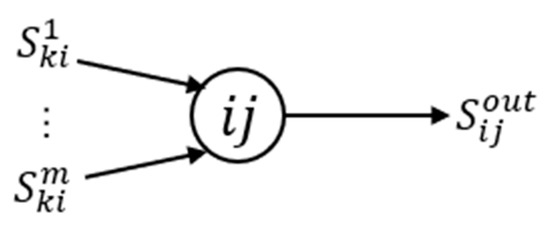 When managing safety in construction projects, not all individual activities contribute equally to the project’s significance; the safety standards of each process directly impact the overall safety of the project. However, assessing the safety status of the entire project cannot simply be achieved by summing up the weighted safety standards of each process [31]. The safety level of a process is influenced by its own safety standards and constrained by the safety levels of preceding processes. In order to assess the overall safety status of a project more accurately, this study introduces the theory of system reliability models to quantify the safety level index of the entire project, as shown in Figure 4. Focusing on the individual construction process, we assume that process ij has m preceding processes ki. In this scenario, the safety level index of process ij can be expressed as: