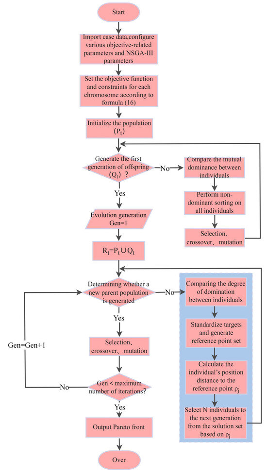 Deb, an Indian scholar, advanced NSGA by proposing NSGA-II, a non-dominated sorting genetic algorithm with an elite strategy [34]. NSGA-II significantly improves upon NSGA by primarily optimizing the non-dominated sorting. Specific improvements include the introduction of an “elite strategy,” which merges parent and offspring populations, selects the next generation through competitive selection, and swiftly identifies outstanding individuals through hierarchical sorting based on individual dominance relationships. Additionally, the algorithm reduces computational complexity through non-dominated sorting methods and introduces the concept of crowding distance to maintain population diversity and effectively define the search scope of the Pareto optimal solution set.