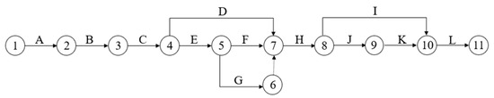 In the equation, T denotes the total project time; L represents the set of all paths in the network diagram; Lg signifies the collection of all processes on a critical path in the network diagram; tij stands for the duration of process ij; tdij indicates the minimum time of process ij; tcij represents the maximum time of process ij.