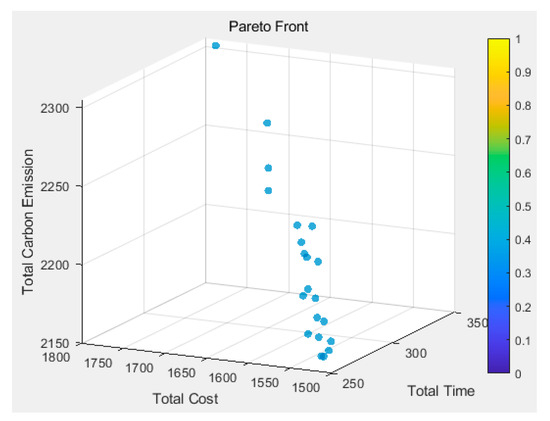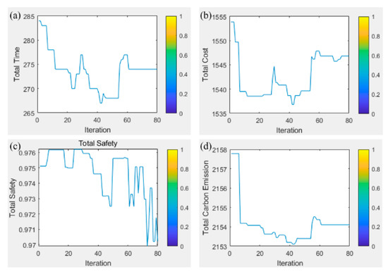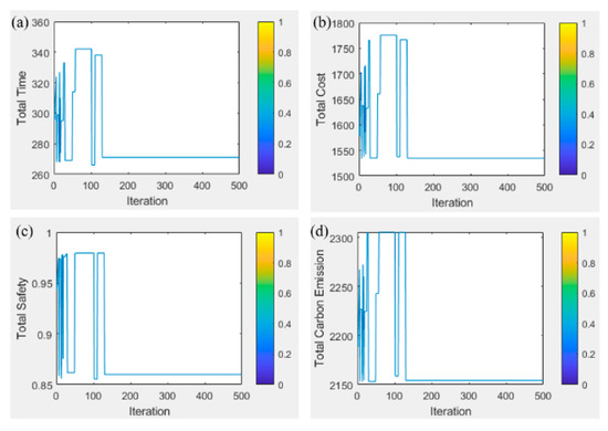 To verify the applicability of the algorithm for the four-objective optimization problem in the engineering project, NSGA-III is used again in this study to solve the model. The final iteration graphs for each objective are shown in Figure 13a–d.