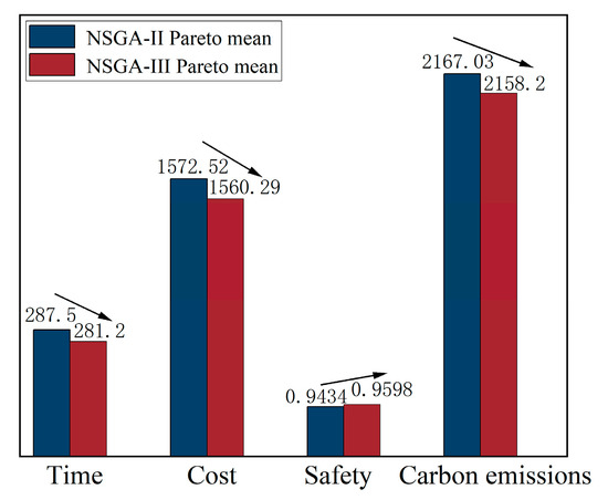 After executing the algorithm programs, two sets of solutions based on NSGA-II and NSGA-III were obtained, respectively, each set being the optimal values under the constraint conditions. Both algorithms achieved optimization effects. However, the NSGA-III required only 80 iterations to search for a superior solution set, while the NSGA-II needed more iterations, resulting in a longer optimization time. Furthermore, the NSGA-III discovered a larger number of solution sets with greater diversity in each solution compared to the NSGA-II. Finally, the range, variance, and standard deviation of the two algorithms were calculated and compared, as shown in Table 7. Values corresponding to each objective of NSGA-III were relatively small, indicating stable performance and sustained population diversity, thus avoiding premature convergence. Therefore, the Pareto averages of the objectives obtained using both algorithms were compared, as depicted in Figure 15, illustrating overall superior optimization performance with the NSGA-III algorithm. Considering these three aspects, this paper selects the Pareto solution sets obtained by the NSGA-III for decision-making, providing the most satisfactory solutions to stakeholders.