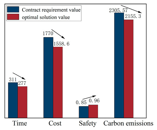 By utilizing the entropy–VIKOR method for decision-making, the optimal solution is identified as Proposal 3 based on the results obtained. Proposal 3 has a total project time of 277 days, with specific construction days for each process detailed in Table 12. Comparisons are made between the selected Proposal 3, serving as the optimal solution, and the target values specified in the contract requirements, as depicted in Figure 16. The project timeline aligns with the overall completion time within the contractual deadline, achieving a 34-day lead time, a reduction of 10.93% compared to the contract’s project time. The incurred cost amounts to RMB 15.586 million, staying below the maximum completion cost specified in the contract, resulting in a decrease of RMB 1.414 million, or 8.31%, below the contract price. The safety level index stands at 0.960, meeting the required standards with an enhancement of 0.11. The carbon emissions amount to 2155.3 tons, reflecting a decrease of 150.27 tons of CO2 compared to the contract requirement, translating to a 6.51% reduction. Through the NSGA-III for MOP problem-solving, the results not only adhere to the constraints but also achieve optimized objectives. The decision-making process has effectively identified the best solution for project managers, enabling them to comprehensively plan construction projects based on the optimal solution.