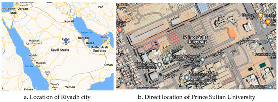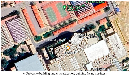 Riyadh, Saudi Arabia’s capital and main financial center, is located in the country’s geographic center and the center of the Arabian Peninsula. As shown in Figure 2a–c, the building under investigation is in Riyadh City.