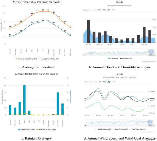 - World Weather Online. Available online: https://www.worldweatheronline.com/riyadh-weather-averages/ar-riyad/sa.aspx (accessed on 1 April 2024).