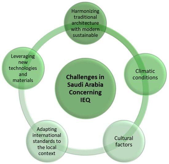 Enhancing the indoor environmental quality (IEQ) in Saudi Arabian educational buildings presents unique challenges and opportunities influenced by the country’s distinct climatic conditions and cultural factors (Figure 5). Understanding and addressing these challenges is crucial for improving the learning environment and ensuring the well-being of occupants. Saudi Arabia’s harsh climatic conditions, characterized by extreme temperatures and low humidity, pose significant challenges to maintaining optimal IEQ in educational buildings. Alwetaishi’s study [26] published in “Energy and Buildings” highlighted the difficulty in achieving thermal comfort in such an environment, which can significantly affect students’ concentration and learning outcomes. Additionally, while culturally significant, the traditional architectural designs often do not align with modern IEQ standards, as Adenle and Alshuwaikhat [27] noted in their examination of sustainable practices in Saudi architecture. Air quality within educational buildings is another challenge, exacerbated by the reliance on air conditioning systems to combat the heat. A study by Adenle and Alshuwaikhat [27] discussed the influence of air conditioning on the indoor air quality in Saudi schools, noting the prevalence of pollutants and inadequate ventilation as critical concerns.