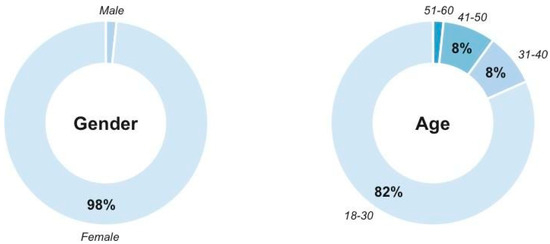 Figure 7 below shows basic information about the 63 occupants who completed the survey. Table 1 shows the occupants’ age grouping. Regarding gender, the number of female respondents is 98%, as the building is on a female campus. About age, most of the building users are students, which is reflected in a percentage of 82%. The remaining 18% are faculty and employees teaching in the building or having offices there.