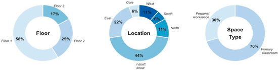 The next set of plots in Figure 9 shows the analysis of survey responses by floor, location, and space type. Of the 63 occupants who responded to the survey, 82% reported that they were near a window, and 86% reported being near an exterior wall. A total of 58% of survey responses were from Floor 1, and 42% reported they did not know their location. A total of 70% of the space type is classrooms, and 30% are personal spaces.