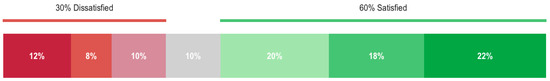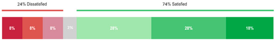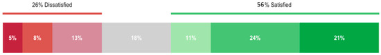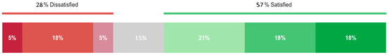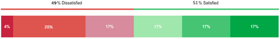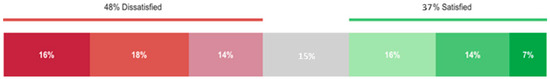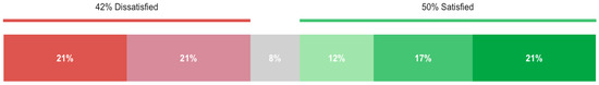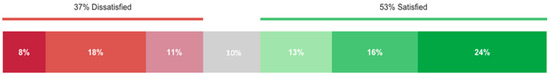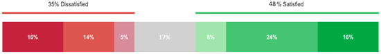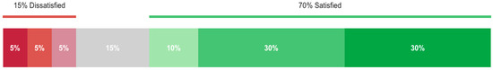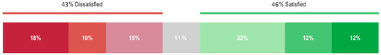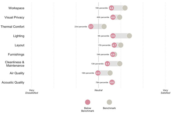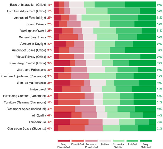Figure 11 depicts building occupants’ overall satisfaction across various categories, from the highest- to the lowest-performing categories. The figure illustrates this with bars, where red numbers on the left indicate the percentage of dissatisfied occupants, and green numbers on the right show the percentage of satisfied occupants. The survey measured thermal comfort, air quality, lighting, acoustics, cleanliness, visual privacy, and ease of interaction. The most satisfaction was observed in the electric lighting category, with 73% of occupants satisfied, while the temperature category saw the least satisfaction, with only 36% content. This figure serves as a straightforward and practical summary for building managers and designers to identify areas for improvement and observe changes in occupant satisfaction over time.
