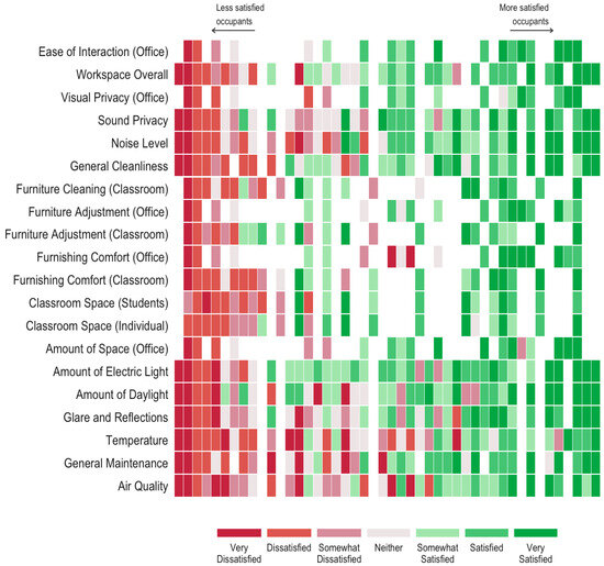 Figure 12 below illustrates the satisfaction ratings of all 63 survey respondents. Each column represents the occupants, while the rows correspond to the satisfaction question they answered. The occupants are organized so that those with less satisfaction are positioned towards the left, while those with higher satisfaction are positioned towards the right. By examining the rows, the reader can promptly identify problem areas related to environmental quality, and by reviewing the columns, the reader can observe how each tenant has indicated their level of satisfaction.