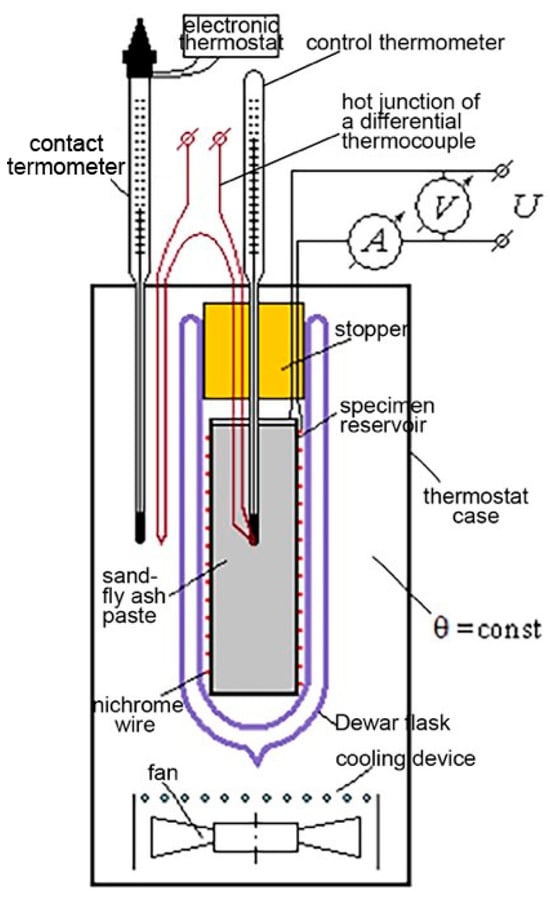 During the experiment, the paste was in an aluminum cup, which was placed in a Dewar flask. A closed Dewar flask with a heater and thermocouple wires was placed in the center of the insulated thermostat housing. An insulated nichrome wire wound on the surface of the sample reservoir served as an electric heater. During the experiments, the temperature of the air surrounding the thermos was maintained constant, and the fluctuations in the temperature of the environment relative to the average value were ±0.3 °C. The sample temperature was recorded every half hour with an accuracy of 0.1 °C. The schematic diagram of the testing machine is shown in Figure 1.