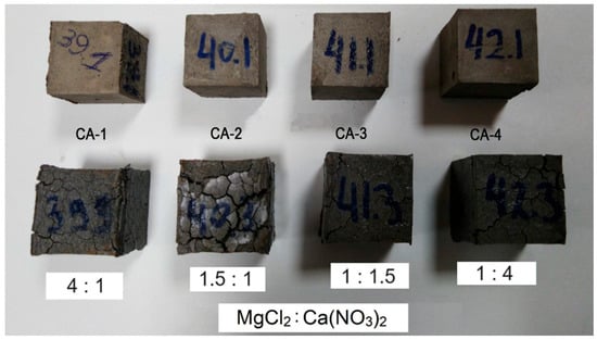 When hardening in air, specimens with the complex additive MgCl2 + Ca(NO3)2 had no visible signs of structural or volume damage. When placed in water 2 days before testing, they expanded and cracked (Figure 2).