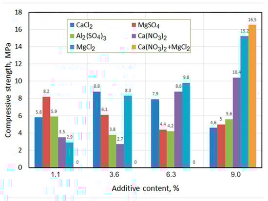 Figure 2 shows a histogram comparing MgCl2 and Ca(NO3)2 with other additives we studied for the binder in question, depending on their dosage. At a minimum dosage of 1.1%, the maximum strength among single salts was provided by the addition of MgSO4, and the minimum strength was provided by MgCl2. With increasing dosage, the strength of specimens containing MgSO4 decreased, and those of specimens with MgCl2 increased and reached the highest values at dosages of 6.3 and 9.0%. At these dosages, the mix with the addition of Ca(NO3)2 was characterized by relatively high strength, second only to specimens containing MgCl2. The combination of MgCl2 and Ca(NO3)2 in a ratio of 1:4 made it possible to obtain a synergistic effect, as can be seen in the histogram in Figure 3.