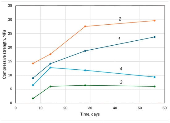 The effect of the age of specimens made of binder from fly ash and silica fume with a complex additive on the compressive strength is shown in Table 6 and Figure 4.