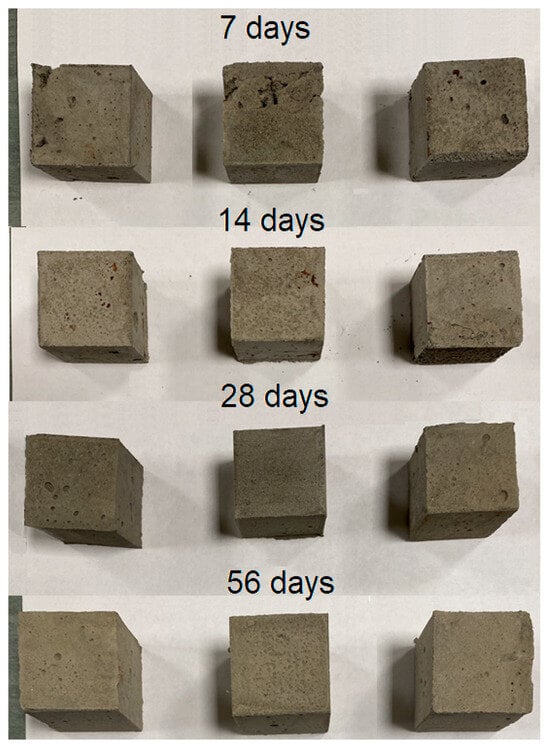 Six specimens of each mixture remained in the molds for the first two days, after which three specimens were placed in water and three specimens were hardened in air at a temperature of (20 ± 2) °C. Tests were carried out when the samples reached the age of 7 days. Before testing, a visual inspection was carried out for cracks, chips, and changes in volume.