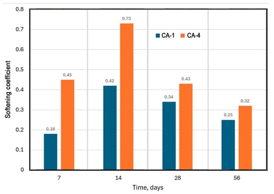 Similarly, the highest water resistance of the specimens was observed at the age of 14 days, with the softening coefficient being 0.42 and 0.73, respectively, for mixes CA-1 and CA-4. Starting from 14 days, the water resistance of the specimens decreased (Figure 6).