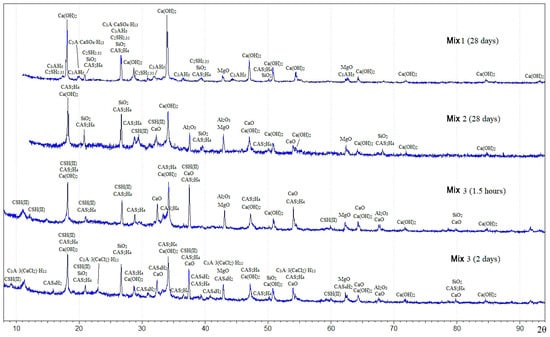 - In the binder from fly ash (mix 2), hardened for 28 days, a significant amount of unreacted free lime (12.8%) remains. At the same time, the Ca(OH)2 content is reduced by more than two times compared to pure fly ash. Instead, significant amounts of calcium silicates and aluminosilicates are formed. As was shown in [], silica fume present in the binder slows down the hydration of ash and free lime.