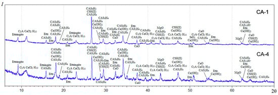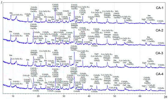 - The phase composition of specimens with a complex addition of MgCl2 + Ca(NO3)2 composition 1:4 (CA-4) in terms of the type and number of new formations is closer to the CN mix than to the MCh mix, which is explained by the four times higher content of Ca(NO3)2 than MgCl2. Here, ettringite is also formed and Friedel’s salt is absent. As subsequent experiments showed, Friedel’s salt appears at a later age. Based on the above, it can be argued that MgCl2 accelerates the hydration of CaOfree, and Ca(NO3)2 and the complex additive CA slow it down.