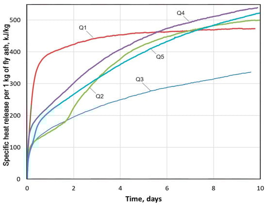 Fly ash containing a significant amount of CaOfree reacts with water very violently (curve Q1) on the first day of hydration, after which the rate of heat release gradually decreases and by the sixth day becomes almost equal to zero. This corresponds to the hydration of f-CaO in expanding clinker, in which more than 50% of f-CaO reacts on day 1, and almost 100% of f-CaO reacts on day 7 [].