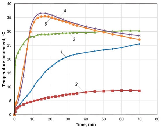 Increase in temperature of paste depending on the additive: 1 is fly ash; 2 is binder; 3 is binder with MgCl2 (MCh mix); 4 is binder Ca(NO3)2 (CN mix); 5 is MgCl2 + Ca(NO3)2 (1:4) (CA-4 mix).