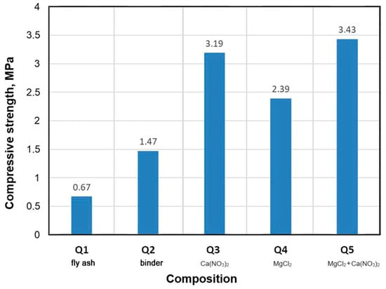 Figure 13 shows that the strength of the mortar (Q5) containing an additive of two salts is higher than the strength of specimens with each of the salts separately. At the same time, the strength of mix Q5 is 2.3 times higher than the strength of mix Q2 based on a binder without additives and 5 times higher than the strength of mix Q1 based on pure fly ash. These data confirm the results of the binder in the paste (Figure 2). However, the strength of the mortar is significantly lower than the strength of the hardened paste, which is explained by the high binder/sand ratio, ranging from 1:5 to 1:7.