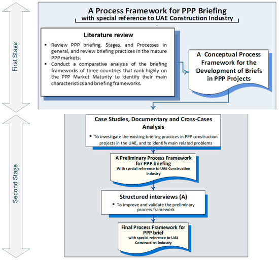 - The second stage has two main methods. First, case studies and document analysis are proposed to localize the above conceptual framework for the UAE PPP market. This is followed by structured interview sessions with experts from the UAE PPP market to finalize and validate the above preliminary framework. The output of this process will be the final Process Framework for PPP brief development with special reference to the UAE construction industry. See Figure 1 for more details.