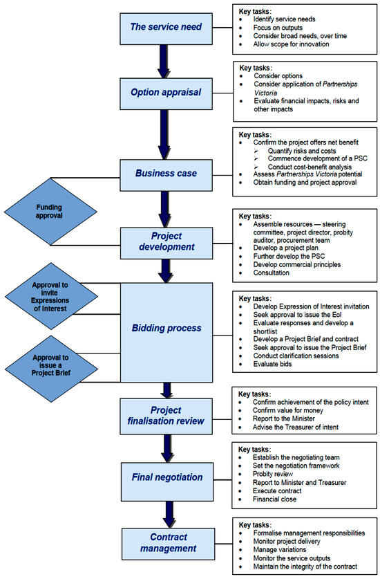 Phases and activities of the PPP delivery process in Australia—Major stages in developing a Partnerships Victoria project—source: [40].