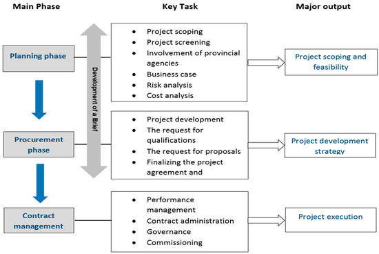 Like Australia, Canada has a worldwide reputation for its procurement process in terms of efficiency and its track record of taking transactions through the procurement process to the financial close. Figure 5 describes the entire Canadian Public–Private Partnership process, as extracted from the Canadian Council for Public–Private Partnerships [47]. The delivery of a PPP project goes through three main phases: (i) planning (the pre-procurement stage), (ii) procurement, and (iii) contract management (operation). The detailed key tasks and major deliverables in each stage are shown in the same figure.