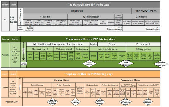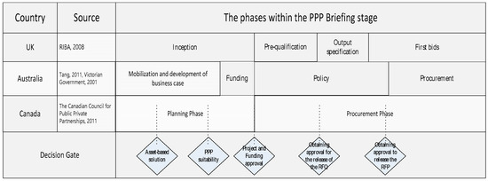 Main phases and decision gates within the PPP briefing stages in the three most mature countries [17,21,40,47].