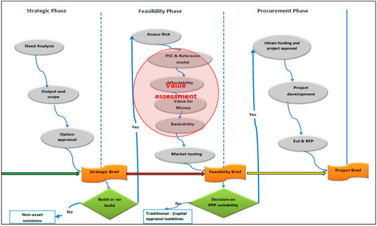 - The Strategic phase: During this phase, a list of reasonable alternative options is investigated based on analyzing the actual strategic and business needs before deciding to proceed with the asset-based solution. This phase consists of three main processes: Needs Analysis, Outputs and Scope, and Option Appraisal. In the Needs Analysis process, the long-term business/service need is identified, project alignment with institutional strategic objectives is demonstrated, and institutional commitment and capacity are ensured. In the second process, the project parameters and scope are investigated through user group analysis and their input, the project parameters and specifications are analyzed, and the project statement of requirements is drafted. Finally, in the Options Appraisal process, possible options to meet needs are identified and evaluated, and a decision on the early suitability of the preferred option is made. The “build or no-build” decision is the first decision gate at the end of this strategic phase of brief development. The “Strategic Brief” of the proposed PPP project is the main deliverable of this phase.