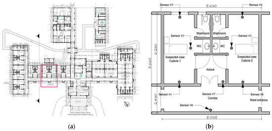 (a) Overall layout of isolation ward cubicle for observational study, and the section highlighted in the red box represents the area used to conduct the research; (b) installed sensors and visual presentations in isolation cubicle which is highlighted in the red box.