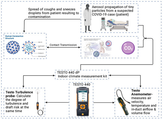 The experimental parameters, including temperature, air velocity, infection level, and pressure, were measured with the Testo 440 dP Air Velocity and IAQ Meter equipped with a Testo Turbulence probe (TTP) and a sensor to measure differences in pressure.
