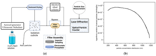 The production of sodium chloride aerosols is demonstrated in Figure 4. An ultrasonic nebulizer was used with a saline solution containing 3-weight percent sodium chloride in distilled water. The solid particles were created by evaporating microdroplets using desiccant drying. Employing laser diffraction and an optical particle counter, we determined the distribution of particle size (Figure 4a) within the isolation cubicle. A flow rate of 0.6 L/min pulled the particles. The impactor sampling and electrostatic precipitator bronze discs were sealed with Teflon tape. Each side had 30 × 25 mm Teflon washers, and the filter assembly was used for filtration. The visible filter area was varied between 2.15, 3.91, and 8.21 mm to obtain the desired flow rate. All the measures were repeated twice and took 120 s each. The named parameters, concentration upstream, and concentration downstream, were used to compute relative efficiency based on measurements taken while moving through an empty tube between them.