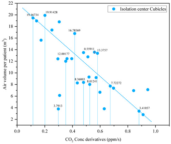 The observed trend line exhibits a notable negative slope, indicating a substantial reduction in air volume per patient as the derivative of CO2 concentration increases. Our analysis shows a negative correlation between the rate of increase in CO2 concentration (in ppm) and the corresponding decrease in air volume per patient (in cm3). Notably, it is noted that for every 0.1 ppm/s rise in the derivative of CO2 concentration, we estimate a decrease of approximately 2 m3 in the air volume per individual. The observed steep negative slope in the data suggests a significant decline in air quality, which can be attributed to the increasing levels of CO2. Authors [56] highlight the importance of implementing measures such as enhanced airflow or minimized occupancy to effectively address and alleviate these adverse conditions. The observed variability among the collected data points highlights the diverse nature of the cubicle environments, thereby indicating the need for personalized evaluations to achieve the most favorable air quality conditions throughout the isolation facility.