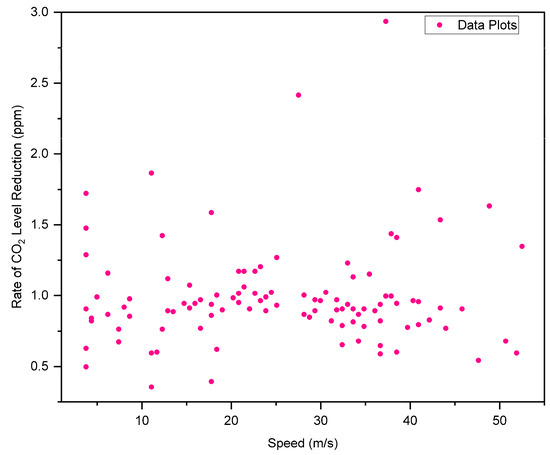 Thus, the observed downward trajectory depicted in the graph in Figure 4 raises concerns and indicates the need for proactive measures to enhance ventilation and decrease occupancy. These interventions would result in an augmented air volume per patient, potentially mitigating the risk of spreading diseases inside the isolation center. This study’s observed distribution of data points exhibits a negative linear correlation. This suggests that there is a tendency for the air volume present per patient to decrease as the derivative of CO2 concentration increases. A dotted line traversing the graph can be interpreted as an indication of a line of the best fit, which strengthens the noticed negative trend exhibited by the data points.