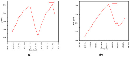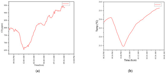 (a,b) Average CO2 concentration (ppm) and temperature differences (°C) in an isolation room during 12 h of observation with an active thermal system control.