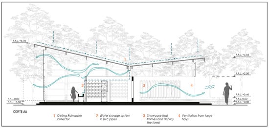 Another notable project is the Mencoriari Technology and Environment Laboratory in San Martín de Pangoa. This building integrates architectural space with pedagogical space to promote environments adapted to the locale, fostering education oriented towards the environmental and cultural revaluation of the rainforest and enhancing accessibility to local employment opportunities [13]. Finally, the plant-drying classroom takes on the appearance of a greenhouse and includes a rainwater harvesting system, as shown in Figure 3 [14].
