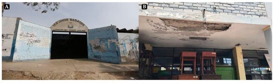 (A) State educational center in Lima lacking adequate infrastructure reprinted with permission from Ref. [28]. 2018, Hugo Pérez and El Comercio; (B) School with roof damage, reprinted with permission from Ref. [28]. 2018, San Juan de Miraflores Municipality.