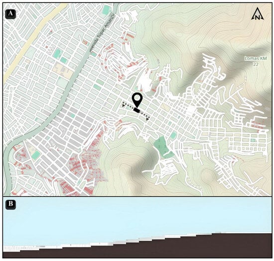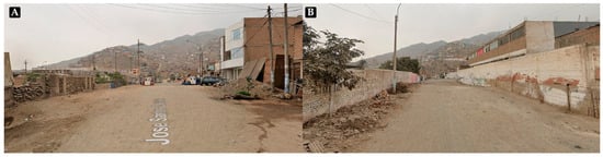 (A) St. Jose Santos Chocano reprinted with permission from Ref. [34]. 2023, Google Maps; (B) Jr. Isabel Chimpu Ocllo reprinted with permission from Ref. [35]. 2023, Google Maps.