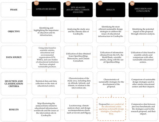 In the first phase, a literature review was conducted to gather relevant information contextualized within the study area. This process allowed for the identification of issues and the establishment of parameters to consider as potential solutions. The reviewed sources included articles from academic journals, educational and environmental organizations (UN and WHO), and case studies of educational institutions that have adopted sustainable practices. This bibliographic review was crucial for developing a deep understanding of the factors affecting the quality of education in Carabayllo and for identifying sustainable design strategies that could be applied to enhance educational environments in this district.