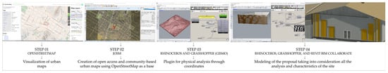 In turn, during the third stage, the key steps for carrying out the proposal using digital tools are described. As a first step, the location of the site was established with coordinates using OpenStreetMap; the second step involved mapping the elements in the immediate project environment (buildings, streets, parks, existing vegetation, etc.) along with project constraints through JOSM in OSM format; the third step involved lifting the environment and topography using Rhinoceros and Grasshopper with the use of the OSM file via the Gismo plugin; for the fourth and final step, a combination of Revit BIM Collaborate and Rhinoceros with Grasshopper was used for modeling the proposed project, as observed in Figure 7.