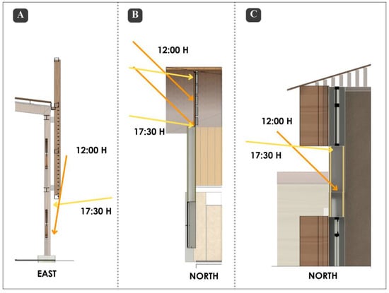 (A) A facade section of the sports slab with solar incidence angles; (B) a facade section of the administration and multipurpose room with solar incidence angles; and (C) a facade section of the educational pavilion with solar incidence angles.