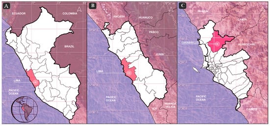 (A) A map of the South American continent, country of Peru, and department of Lima; (B) a map of the province of Lima; and (C) a map of the Carabayllo district.