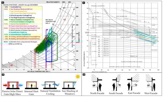 Additionally, Figure 11C depicts other architectural strategies, such as situating the building to maximize climate insulation through material selection and adjustable openings tailored to different facade orientations: 49° on the north, 67° on the south, 40° on the east, and 48° on the west. This design configuration allows the building’s slab to function effectively as an eave for solar protection on each facade [42].