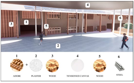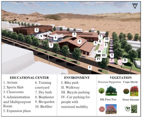 The design proposal integrates eco-friendly materials, including double-layered wooden structures with 0.30 cm insulation, which effectively retains heat within the panels. Additionally, green roofs with vines are implemented for temperature regulation. It also utilizes movable windows and gable roofs for thermal control, solar protection, lighting, and natural ventilation. Prefabricated adobe walls with plaster coating ensure an optimal thermal transmittance of 2.2 W/m2K. Clean technologies are integrated, including 74 photovoltaic panels in classroom pavilions generating 17,582.40 kWh annually for the educational center’s operation, and 20 photovoltaic panels producing 691.2 kWh annually for public lighting, along with photovoltaic pavers, meeting energy needs. Furthermore, the proposal includes using dry toilets for compost production and gray water reuse through biofilters. Vertical gardens with native vegetation reduce water usage and maintenance costs, promoting connection with nature through student-managed cultivation, which also contributes to their nutrition.