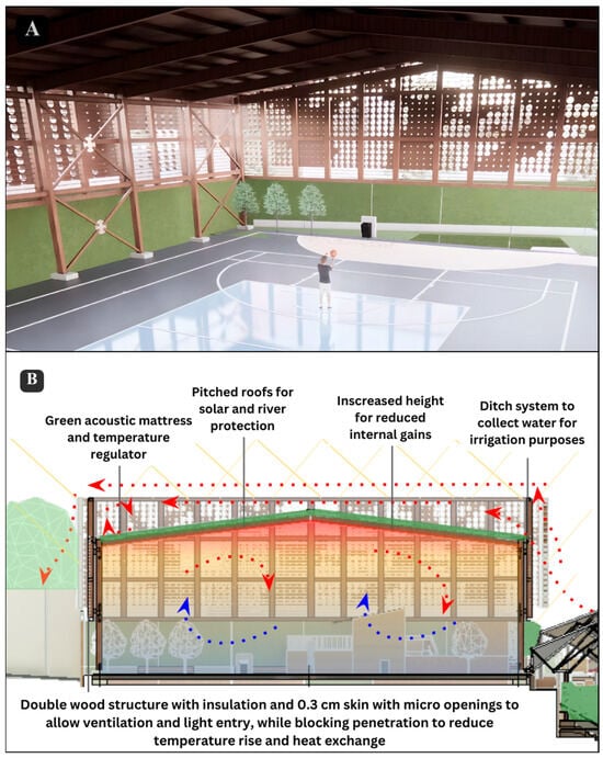 (A) The interior of the sports slab with the structure; (B) a schematic section with an environmental explanation.