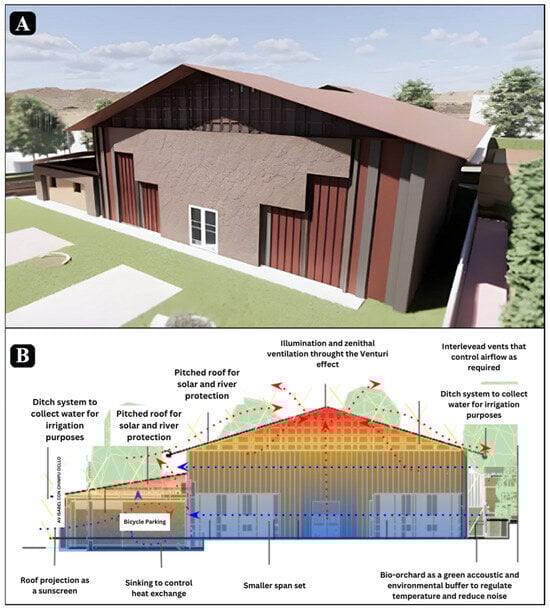 (A) Administration and multipurpose Room; (B) schematic section with environmental explanation.