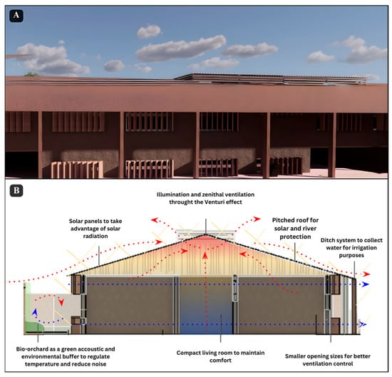 The administration and multipurpose room are equipped with a system of movable windows on the ground floor, designed to adjust according to lighting and protection needs at different times, along with a grid of 0.5 × 0.5 m windows at the upper part to regulate ventilation, as seen in Figure 15A. Additionally, a central skylight is installed to harness zenithal lighting throughout the building and facilitate natural ventilation with a chimney effect. Furthermore, as depicted in Figure 15B, these buildings feature gabled wooden roofs with a 30° pitch and a 2 m projection, providing protection against solar incidence on the facade and roof, as well as rainwater runoff management. Prefabricated adobe walls, 30 cm thick and coated with lime, are used to ensure thermal comfort and prevent air leakage through the walls and openings. The chimney effect occurs when air enters the environment, depicted by blue arrows for cold and red for hot; it cools the internal space while hot air concentrates at the top and disperses through the skylight. This graphic illustrates how the internal space remains cooler (blue) due to incoming air while the upper part is warmer (yellow and orange).
