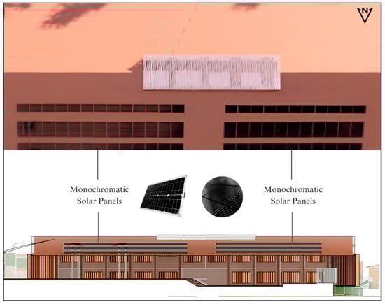 The strategic placement of the classroom pavilion and administration, along with the multipurpose room, maximizes natural lighting throughout the year, positioned from east to west relative to the orientation shown on the solar chart. On the other hand, the sports slab, oriented differently than recommended by the solar chart, required additional design strategies to ensure natural lighting and protection against direct solar penetration, considering that the educational center is open from 8 a.m. to 2 p.m. Given the high level of physical activity that occurs once a week in the sports slab area, which influences internal heat gains, an enhanced facade protection strategy was necessary, as observed in Figure 13.