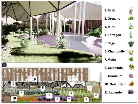 Orchards with the use of biofilters (recycled water for irrigation), vertical gardens, and biodiverse gardens feature native and xerophytic vegetation, providing climatic, economic, and social benefits. These are achieved through the integration of open classes in these spaces to foster nature-based learning. Additionally, the produce from these gardens serves as a food source for students in the cafeteria. Furthermore, the introduction of this vegetation significantly reduces water usage, gray water treatment, and maintenance costs, thereby promoting an appreciation of natural heritage from a young age, as observed in Figure 19A. Furthermore, Figure 19B shows the cultivation of two main categories of vegetables: the first category includes aromatic and medicinal plants such as basil, oregano, mint, thyme, peppermint, rosemary, tarragon, dill, sage, laurel, coriander, lemon balm, muña, lemon verbena, and chamomile. In addition, floral species such as calendula, geranium, nasturtium, lavender, wormwood, rue, cosmos, borage, and fennel will be implemented [45].